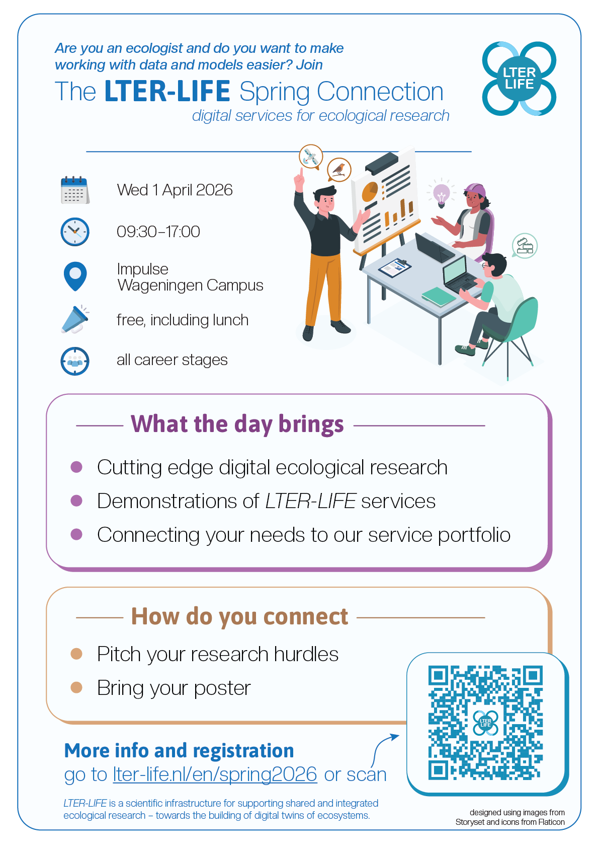 The next LTER-LIFE semi-annual meeting will take place on 1st of April 2026 at the campus of Wageningen University. During this day we would like to ask you to help us shape the LTER-LIFE infrastructure. Based on three invited speakers and you, as participants, we will explore the way ecological research is done and the hurdles in sharing, finding, re-using data, models and scripts and in setting up extended analyses that have a high level of complexity, high computational or storage demand. We will demonstrate the LTER-LIFE service portfolio and discuss how it can be refined to support the way you work.